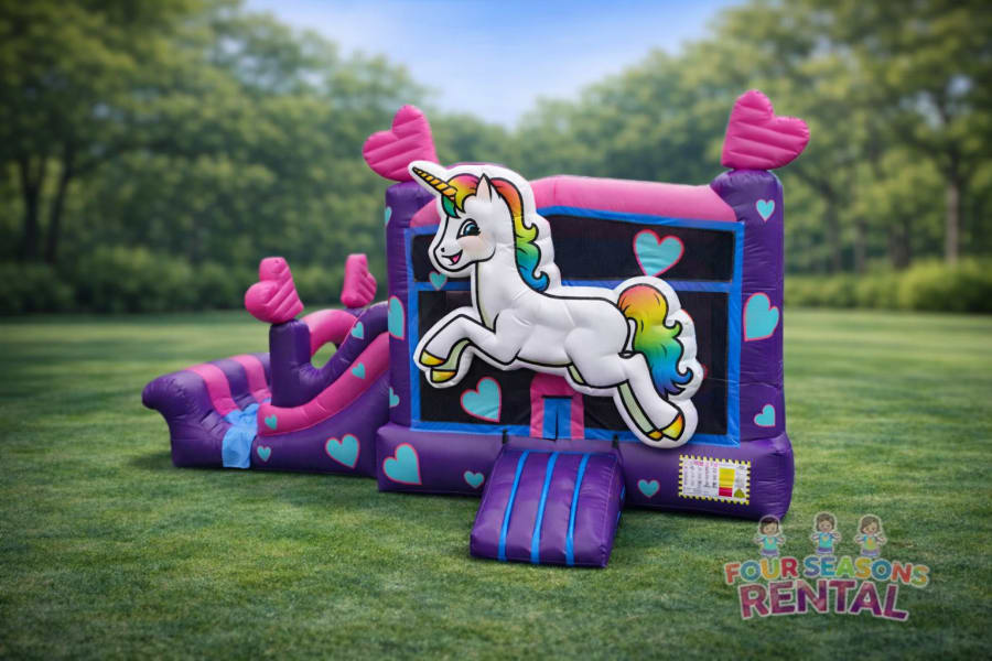 Do you believe in Unicorns? All of us a Four Seasons Rental in Newark New York do. Check out this new colorful eyecatching bouncer with slide. With a large bouncing area a slide that can be used wet or dry and a basketball hoop inside for added fun its sure to make your child's party magical. Four Seasons Rental offers delivery and set up of all combination style jumpers making your job as party planner a little easier. Combination style jumpers are able to be set up outside or inside providing there is adequate space and drainage if using water. Combination style jumpers are secured in the outside setting with multiple steel stakes driven deep into the ground, inside settings utilize sandbags ensuring a safe and fun environment for all guests. The blowers used to inflate these units run on standard 120-volt power making them useable at almost any back yard party or event. Four Seasons Rental is Conveniently located in Newark, New York and services all of Wayne, Monroe, Ontario, Seneca and Cayuga Counties.
